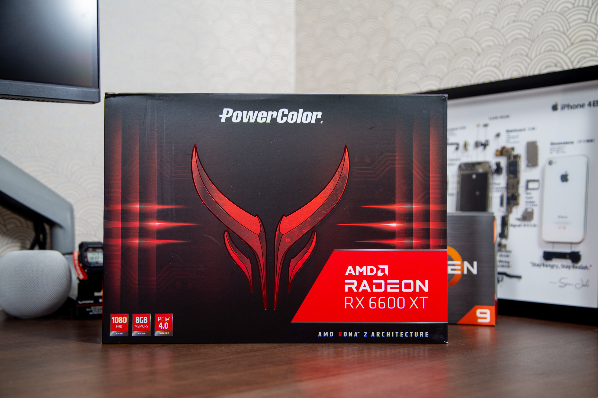 包装一角是1080P、8GB显存设计、支持PCIe4.0。可见AMD对6600XT的定位很精准,大哥6700XT负责2K分辨率之后,6600XT作为一款甜品级显卡主要满足玩家1080P分辨率下的游戏需求。