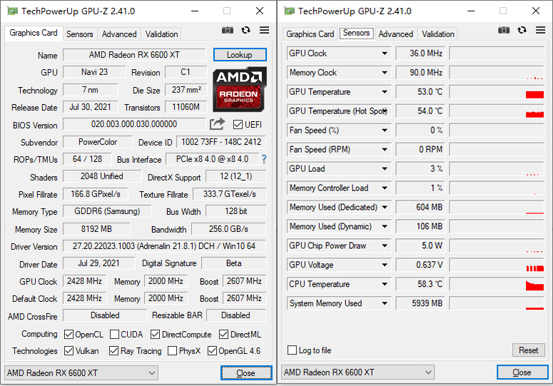 专门为这次测试搭建的目前较为主流的测试平台,希望可以通过测试查看一下这款甜品级的RX 6600XT性能表现怎么样。首先通过GPU-Z可以查看RX 6600XT Red Devil的显卡信息,GPU Clock:2438MHz,BOOST 2607MHz,8GB显存设计,支持PCIE 4.0设计。默认待机温度53℃,测试时室内温度26℃。