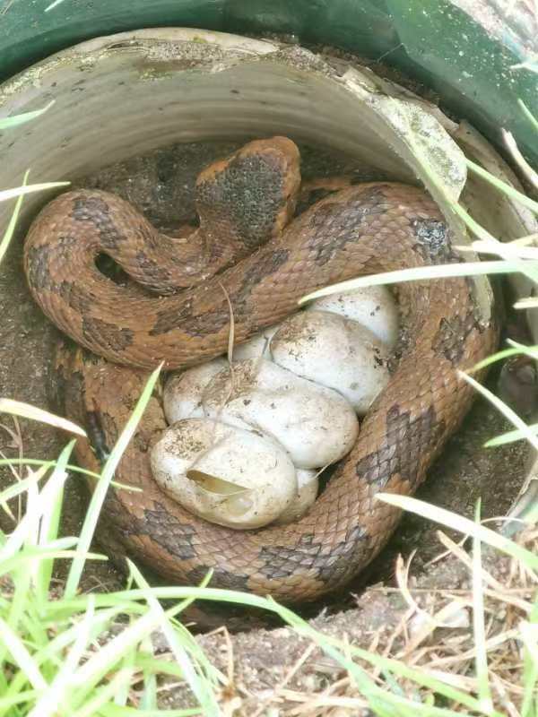 9月2日上午10时左右,云南腾冲一高尔夫球场水阀箱内发现一窝“烙铁头”毒蛇。目前,这条长约70厘米的毒蛇及其6只“宝宝”和3枚未孵化的蛋已移交林草局处置。