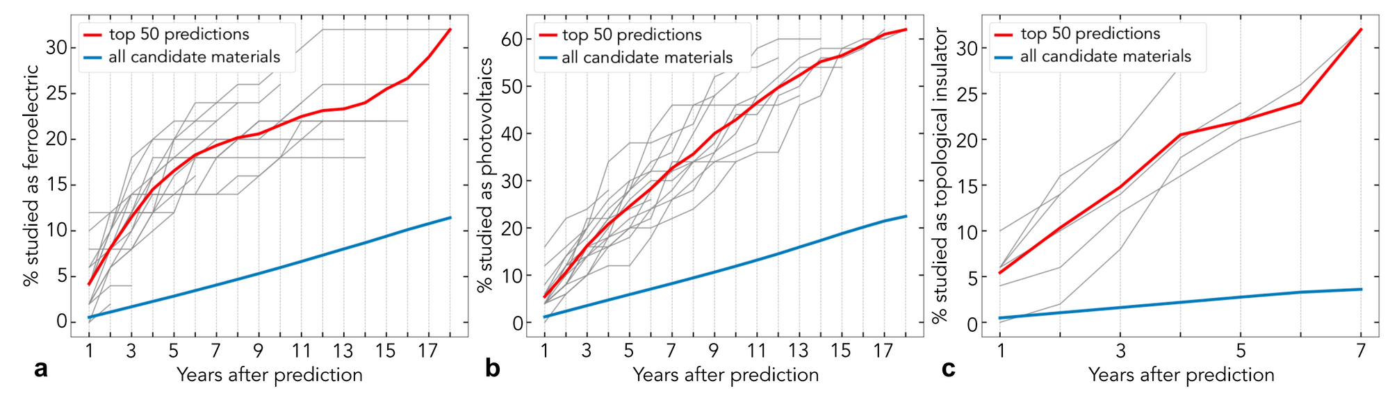 使用在不同时间段的摘要上训练得到的词嵌入预测将在未来的摘要中研究哪些材料作为铁电材料(a),光伏材料(b)和拓扑绝缘体(c ),与所有候选材料相比,更有可能对前50个预测材料进行研究(Tshitoyan等人,2019)。