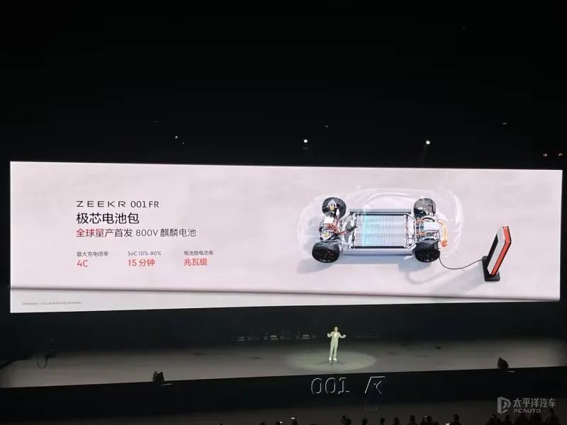 电池部分,极氪001 FR搭载的是100kWh的麒麟电池,配备800V电压平台,电量由10%充至80%的时间仅需15分钟。