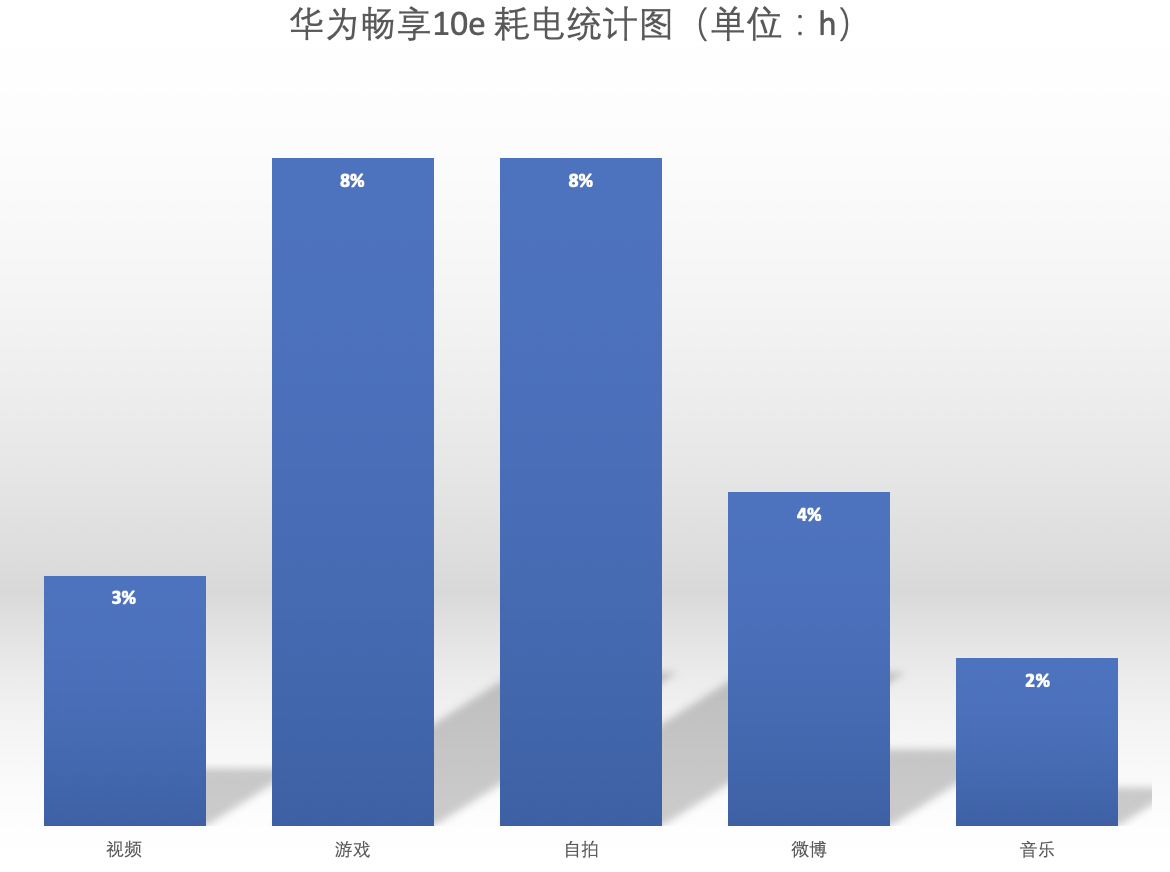 实际测试来看:用华为畅享10e看视频1h耗电3%;玩游戏1h,耗电8%;自拍1h,耗电8%;刷微博1h,耗电4%;听音乐1h耗电2%。