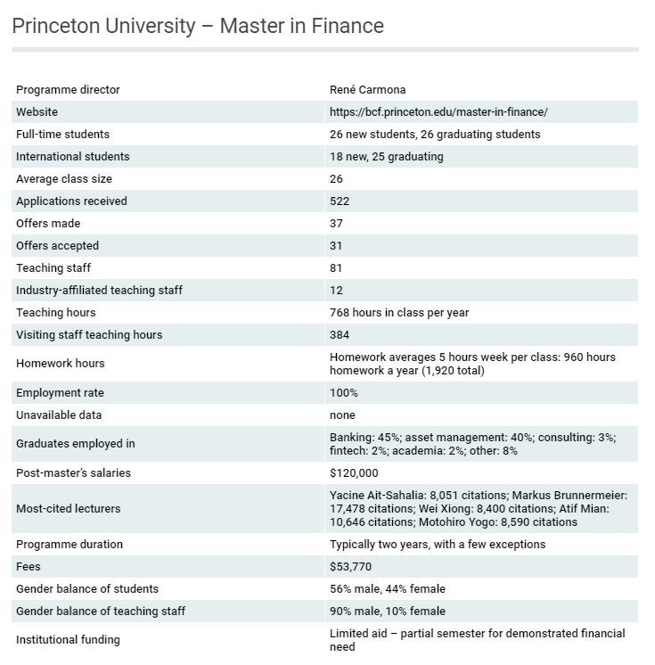普林斯顿大学连续多年保持Quantnet排名第一,该专业在过去四年中为其毕业生提供100%就业率,其平均毕业起薪为12万美金。该专业设置在普林斯顿大学本德海姆金融中心,由René Carmona教授领导。