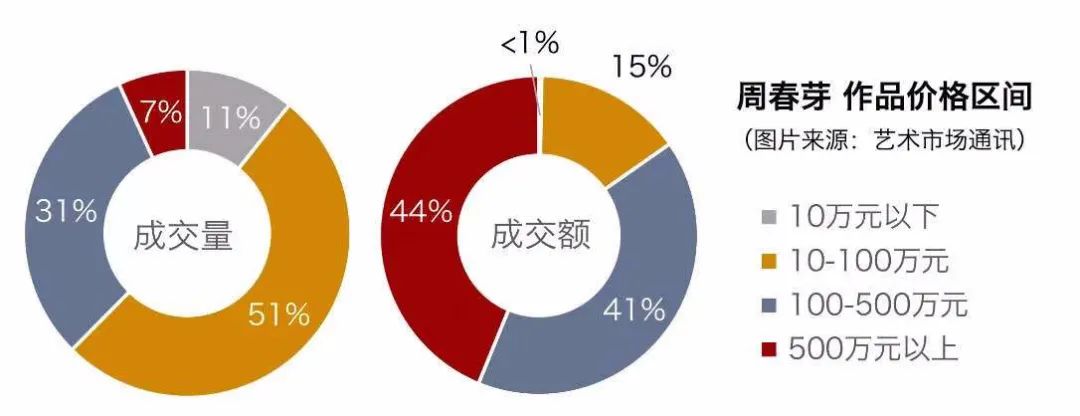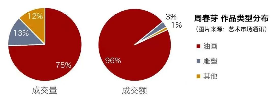 周春芽作品的主要媒介为油画,96%的成交额和75%的成交量由油画所贡献。雕塑在周春芽的艺术生涯中扮演着重要的角色,尽管占比不高,只占3%的成交额和13%的成交量,但却丰富了市场中其作品的类型。值得一提,周春芽的作品成交量是上榜艺术家中最高的,几乎是其他艺术家的2-3倍。