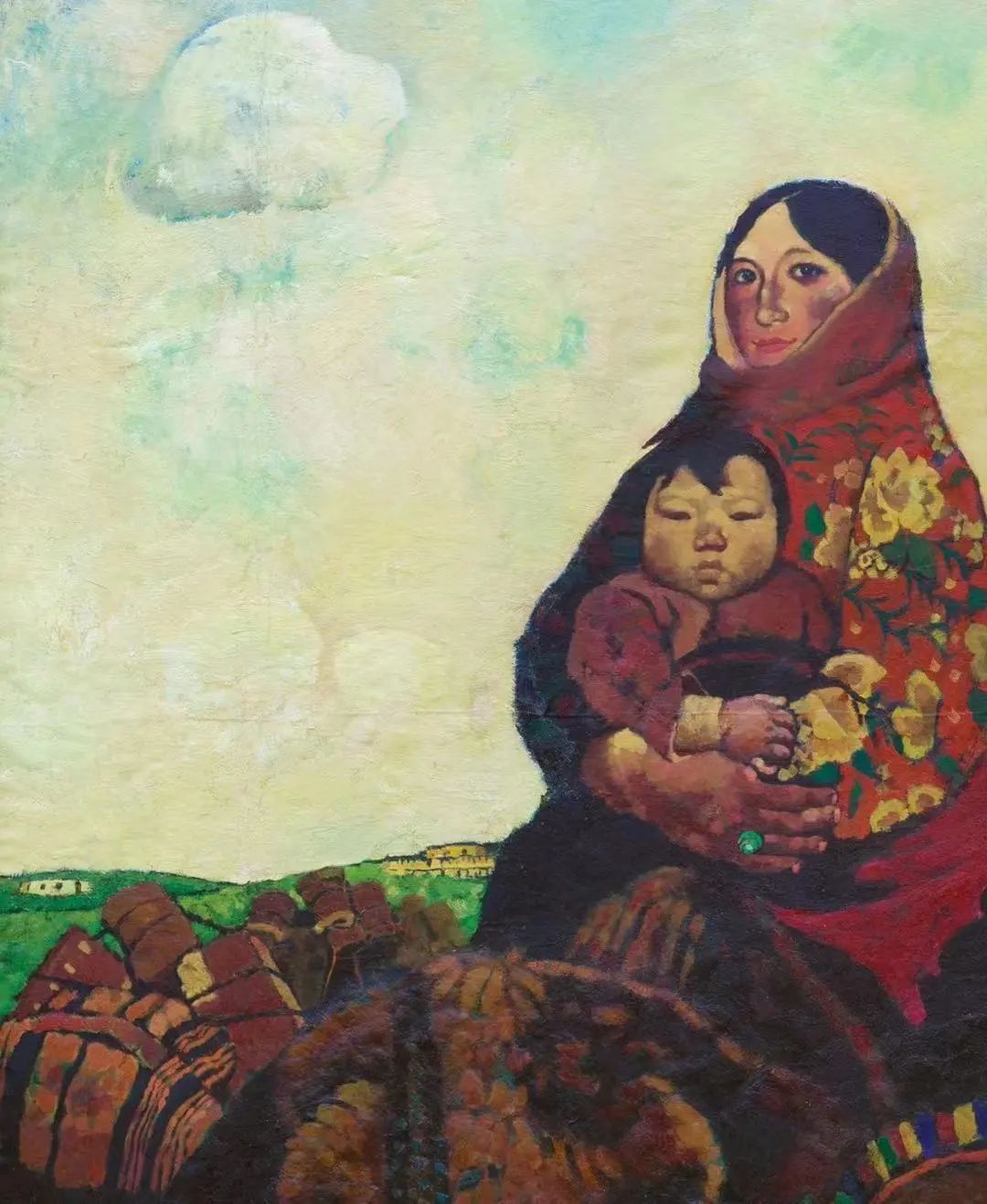 不过,画面中还潜藏一则趣闻:女子手中抱着的孩子,实际上是周春芽照着自己女儿褐褐的样子画的:“画的时候她才三岁,小时候她长得有点‘蛮’,看着还挺像西藏小孩,我就把她画进去了。”