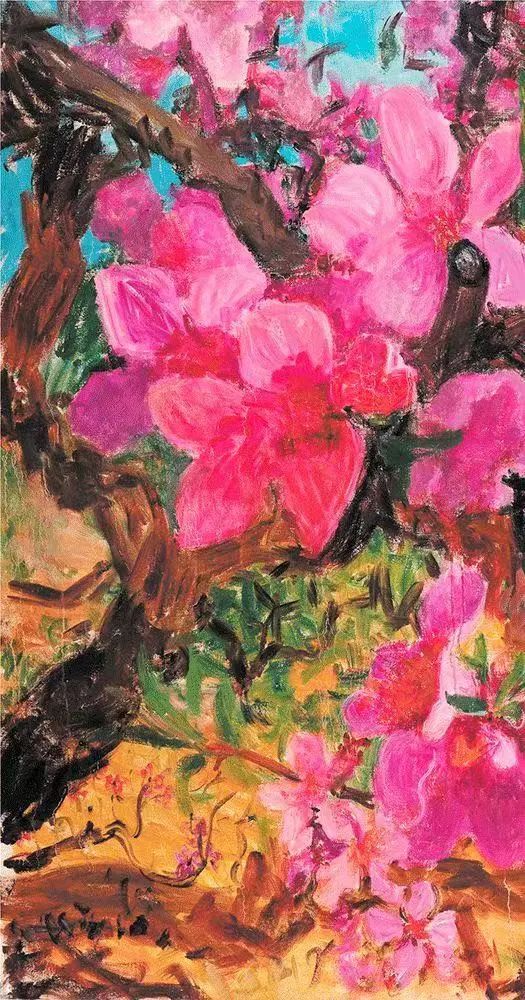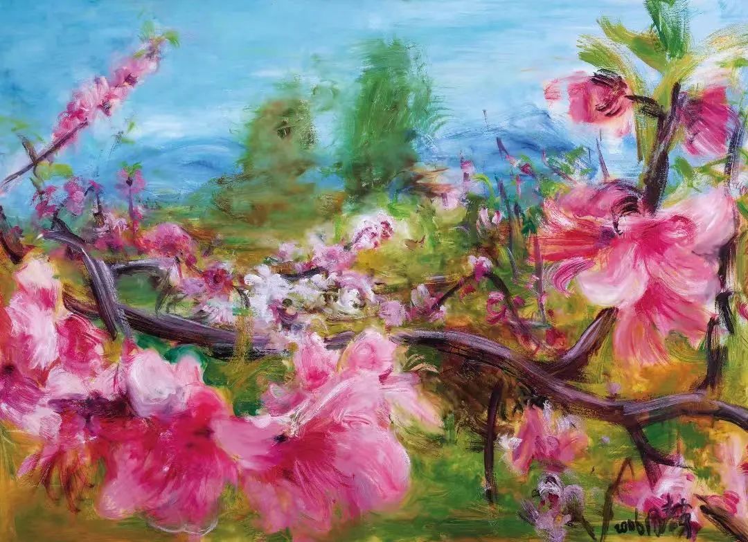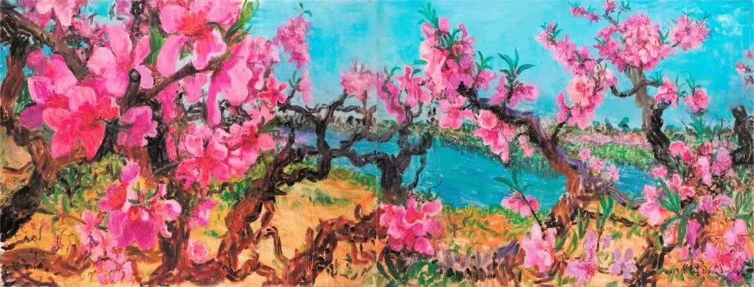 在用色上,近景的艳粉色桃花和扭曲的褐色枝条,与中、远景中的黄色草地、蓝色溪水、天空相互冲击但又融合一处。