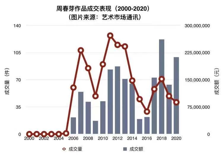 2020年6月4日,周春芽以2019年度公开拍卖市场作品总成交额16,538万元人民币名列《2020胡润中国艺术榜》第4位。