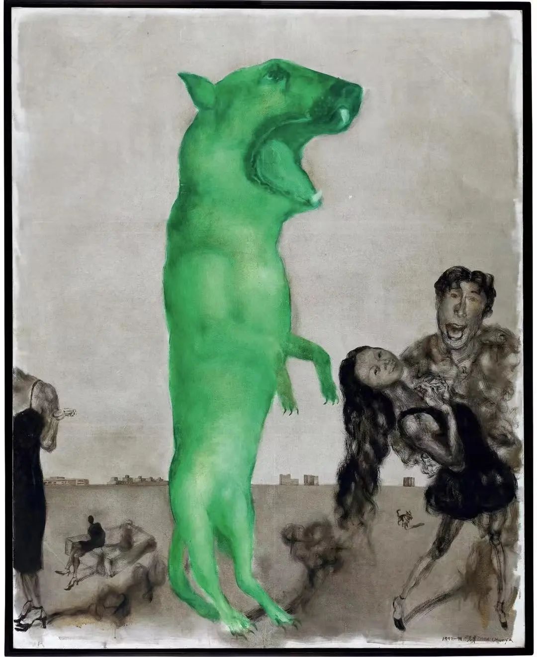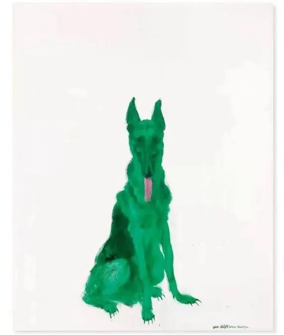 尽管艺术家此后多次回归此题材,但早期“绿狗”系列,无论在造型、技法及构图上,均有着相当的独特性。它们不只是单纯的符号,而是蕴含更多艺术家的情感,造型更为真实的同时,情感更为外显,艺术家以表现主义的风格,把压抑的欲望投放在画布之上。画面后方的人物,更直接预视了后期桃花系列中赤裸身体的出现,重要程度不言而喻。