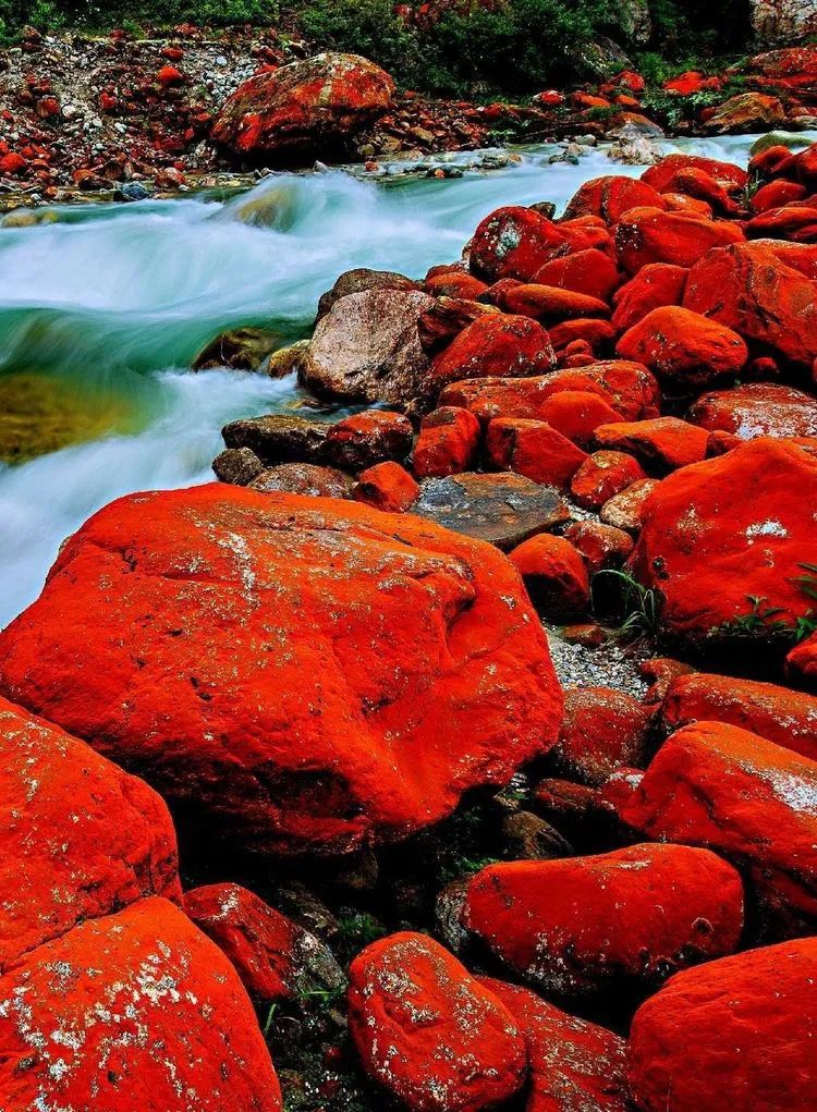 川西,是周春芽早期创作的源泉、土壤和宝库。周春芽的《红石图》的“真山水粉本”,在四川省雅安市雨城区上里古镇一路向西的荒江野滩之上。当时旅游未兴,此处人迹罕至,因其高海拔,高湿度的纯净风土,千古以来,就有一种红色藻类,寄生于石,水流过石,水石俱红,此种景象,向来只供村夫野老玩耍谈笑,未曾入画。红石与春芽,忽而相遇,我见江山多妩媚,江山见我亦如是,一代名作,由此而生。