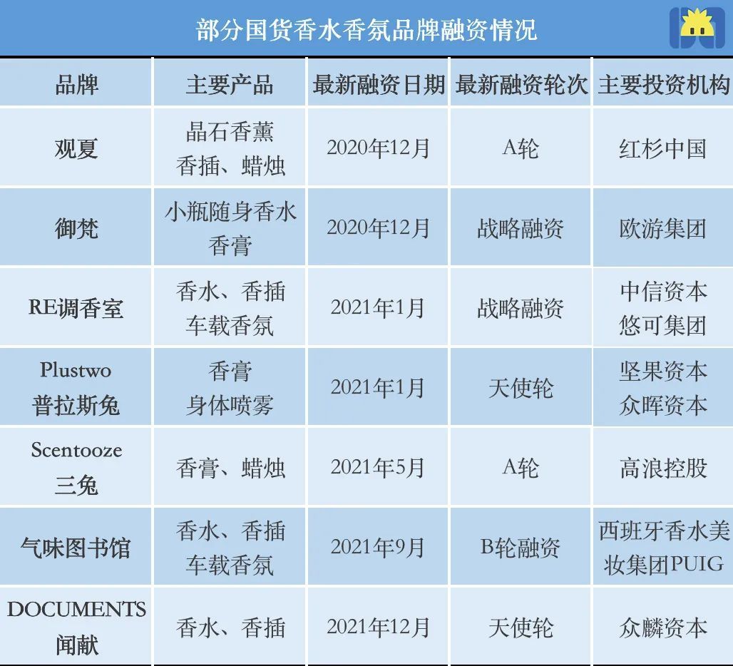 随着疫情给香水经济带来红利,一些香水品牌开始受资本青睐。一个例证是,从部分国货香水香氛的融资情况可以看到,这些品牌在2020年底和2021年集中获得了最新一笔融资。