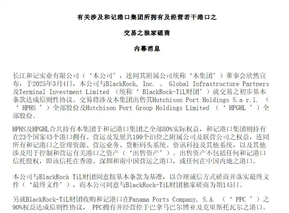 3月4日深夜,李嘉诚旗下长江和记实业有限公司(00001.HK)在港交所公告,宣布与贝莱德牵头的财团达成原则性协议,出售其全球港口业务核心资产,其中涉及巴拿马港口公司90%股权。