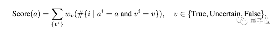 在实际操作中,一旦一个答案被确认为错误,那就不会进行额外的验证,从而得到一个错误的验证状态。研究人员分配相应的权重给这些状态:真实(wT)、不确定(wU)和错误(wF)。