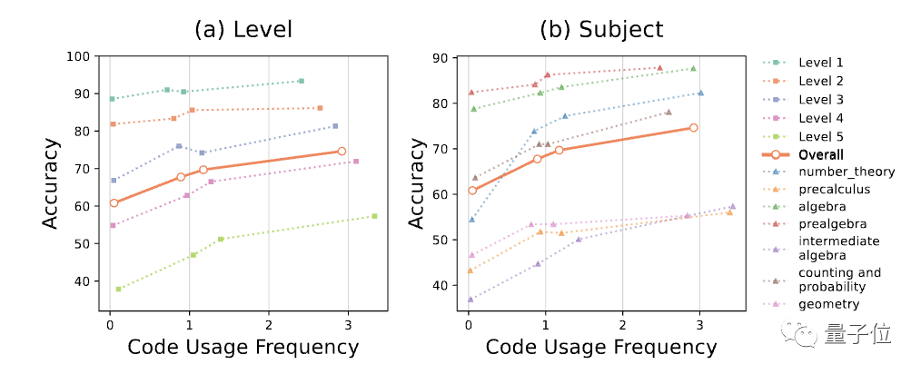 研究人员还发现GPT-4代码解析器的代码使用频率提高与准确率提高正相关。随着题目难度的增加,代码使用频率稳步上升。这说明在较难的数学问题上,更频繁地使用代码很重要。