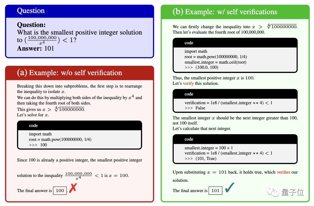 通过上图这个例子可看出,在没有自我验证的情况下,模型生成了一个错误的答案。通过自我验证,模型纠正了错误并生成了正确的答案。