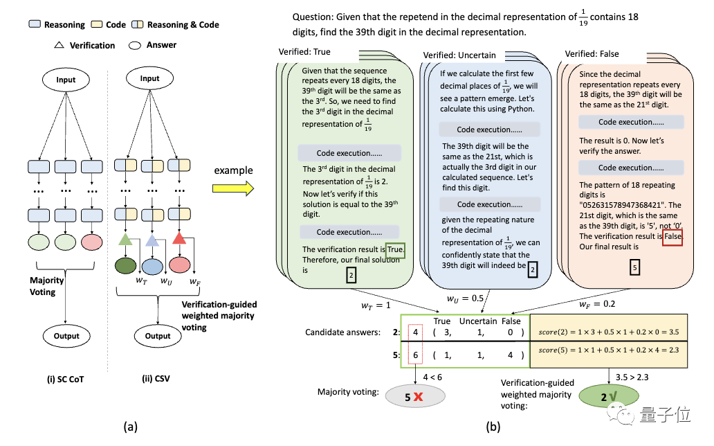 研究人员窥探了其代码生成和执行机制,使用自我验证、验证引导加权多数投票的方法,直接打开其做数学题的任督二脉。