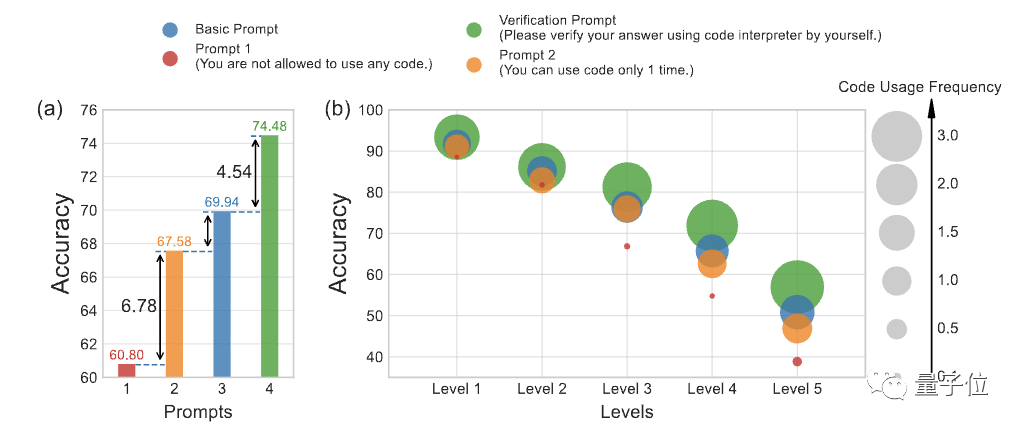 (a)不同提示回答准确率比较(b)代码使用频率与五个难度级别准确率都成比例,这种现象在数学问题相对复杂时尤为明显。