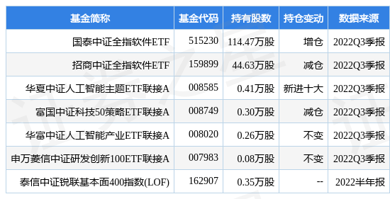 其中持有数量最多的基金为国泰中证全指软件ETF,目前规模为2.64亿元,最新净值0.7755(12月27日),较上一交易日上涨0.44%,近一年下跌23.54%。该基金现任基金经理为苗梦羽。