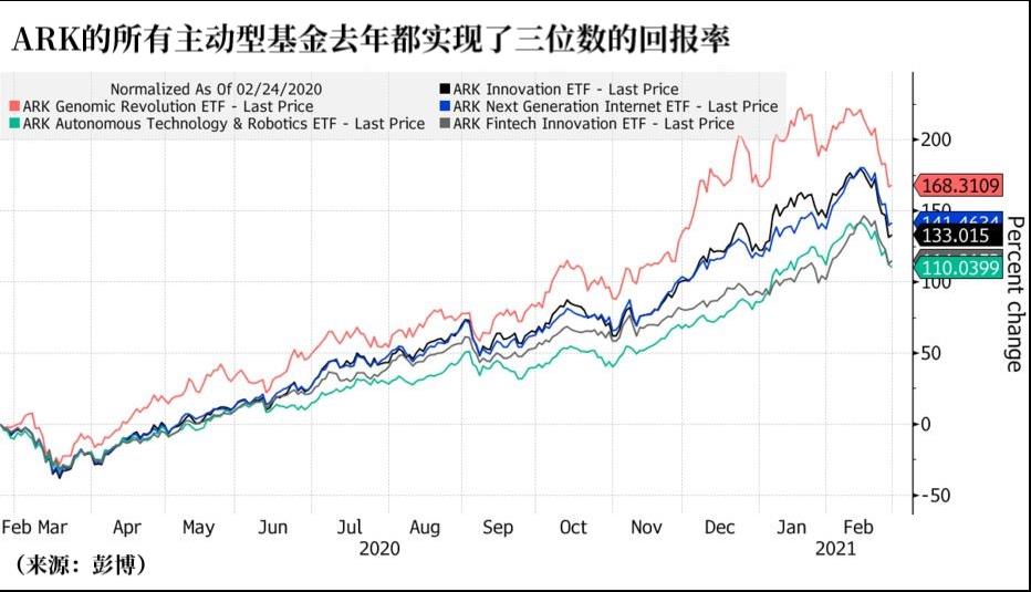 ARK(方舟投资)由Cathie Wood在2014年创立,ARK专注于投资“颠覆性创新”的机会,即基因科技、机器人技术、人工智能、能量存储和区块链技术。ARK旗下的主要ETF,ARKK,自从创立以来表现高出纳斯达克指数约136%。今年一月ARK系列基金赢得了比传统投资管理巨头贝莱德、道富更多的资金。目前ARK坚持“买入成长中小盘股,卖出价值大盘股”的策略。ARK基金是全球第九大ETF发行机构。