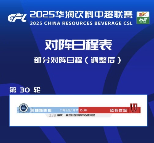 根据2025华润饮料中超联赛赛程,深圳新鹏城对阵成都蓉城的比赛将于11月22日15:30在深圳市体育中心体育场进行,由于深圳赛区举办全运会和残特奥会比赛,为保证本场比赛安全有序进行,经深圳新鹏城足球俱乐部申请,协商深圳赛区、成都蓉城足球俱乐部以及有关方面同意,现决定将深圳新鹏城对阵成都蓉城比赛进行调整,具体调整如下: