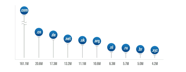 截至 2022 年6月30日,按报告域名数量计算最大(注册量最高) 的TLD 分别是:.com、.cn、.de、.net、.uk、.org、.nl、.ru、.br 和 .xyz。