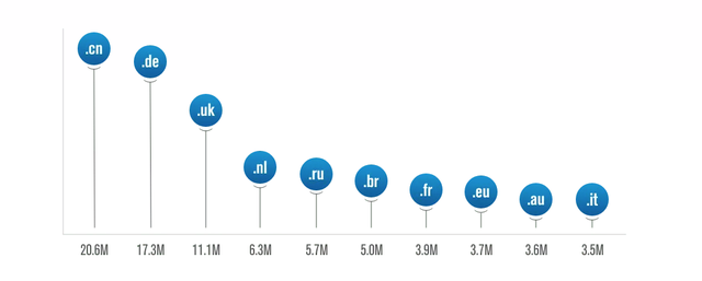 截至 2022 年6月30日,注册量排名前 10 位的ccTLD(国家及地区顶级域名) 分别是: .cn、.de、.uk、.nl、.ru、.br、.fr、.eu、.au 和 .it。
