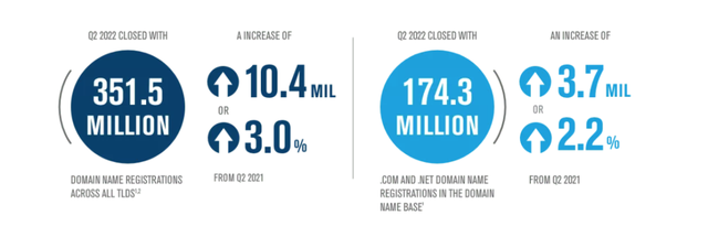 截至 2022 年第二季度末, .com 和 .net 注册总数为 1.743 亿,与第一季度相比减少了 40 万,即 0.2%↓ 。截至2022年6月30日,.com域名注册量为1.611亿,.net域名注册量为1320万。