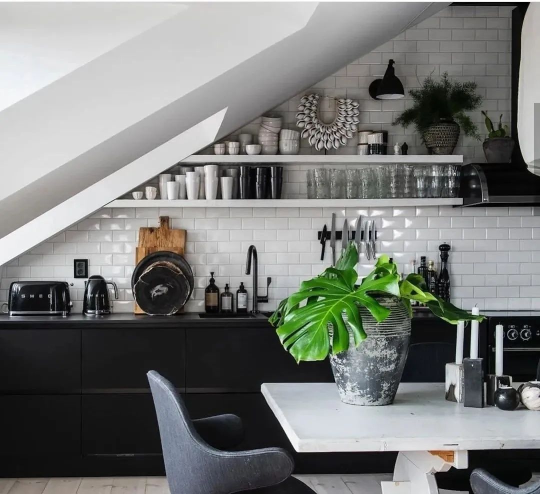 餐厅斜顶: 餐厅斜顶似乎很浪费空间。不过咱们可以在斜顶的底部做一排储物柜,这样就能完美的利用到空间,也不会感觉到哪里不对劲;