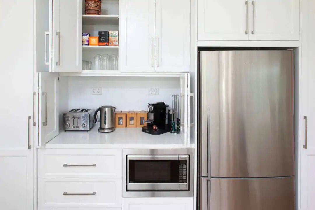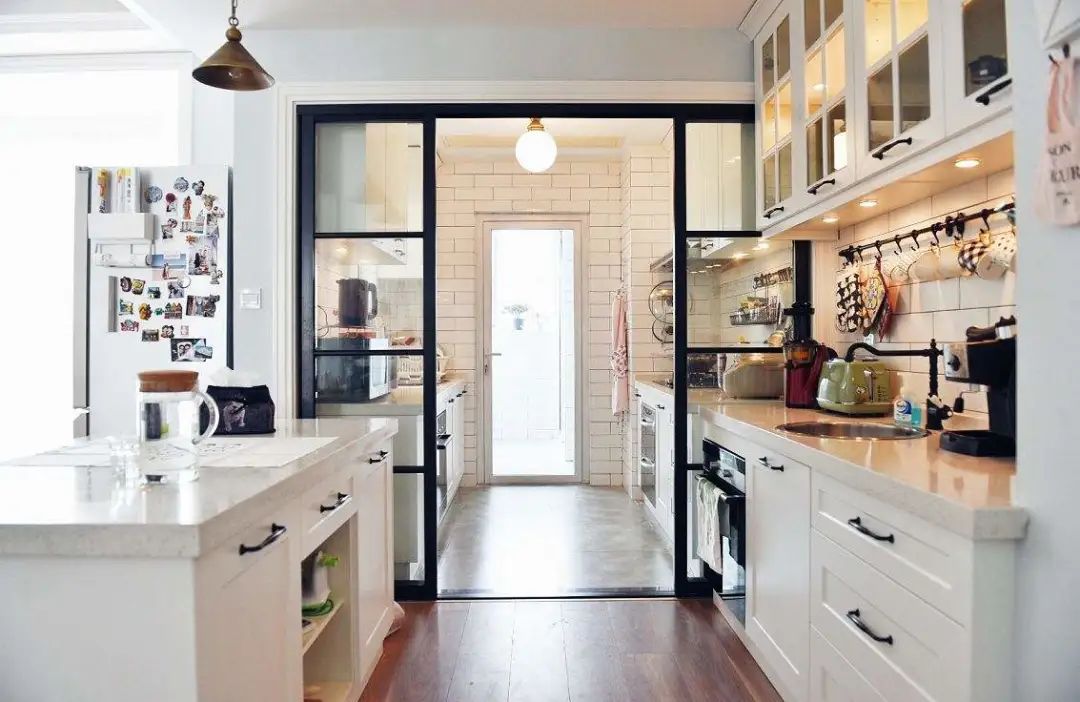 厨房有凹角: 不少厨房都会有个鸡肋的凹陷角落,好像啥也干不了,白白浪费空间。其实,这块区域刚好可以做个储物柜,放些平常所需的食材、米、面、油等…当然,还有些朋友会在这块区域塞个冰箱;