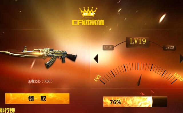 接下来就是第二个土豪的专属活动了,财富值这款活动也是存在了很长一段时间,为何说土豪专属呢?相信不少的玩家可能已经心知肚明,没错,既然活动叫做“财富值”那自然是根据我们在游戏内充值的金额来获取相对应的极品武器和装备的,等级越高奖励越丰富,像以前极其极其稀少且绝版的王者之心以及雅典娜都起源于这款活动之中的!你是否还记得呢?