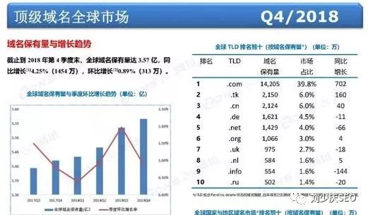 根据2018年第四季度全球域名发展统计报告显示,截止到2018年年末,在全球顶级域名中,.com以14亿的保有量稳稳占据排行榜第一的宝座,比第二名.tk的域名保有量多6倍!