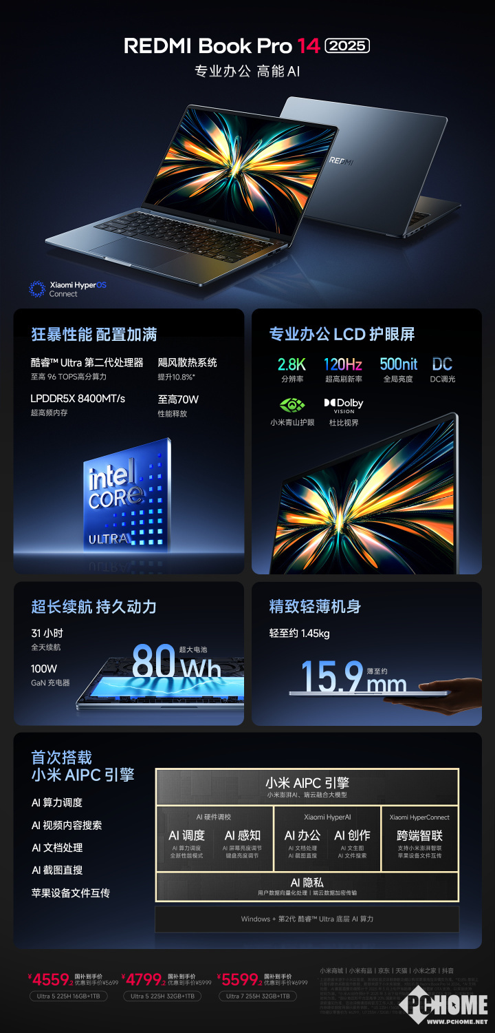 REDMI Book Pro 14 2025同样至高搭载第二代酷睿Ultra 7 255H处理器,在紧凑机身中实现70W性能释放,80Wh电池带来31小时超长续航。2.8K 120Hz高亮屏延续专业色彩标准,100% sRGB色域与全局DC调光技术,配合100W多协议快充适配器,成为移动办公利器。该机型完整集成AI PC引擎能力,在文档处理场景中WPS大文件打开速度提升26.09%,并支持跨平台文件互传与汽车热点自动连接等生态互联功能。