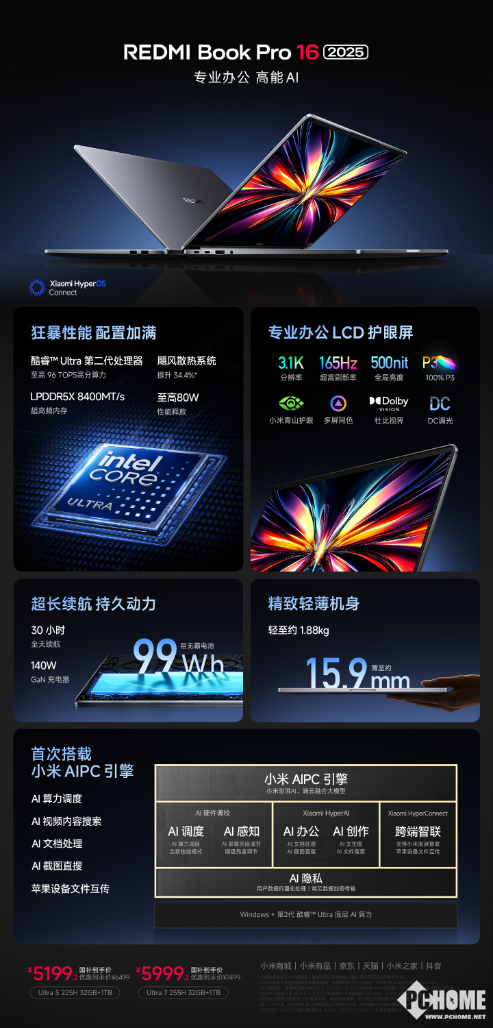在Xiaomi 15 Ultra与SU7 Ultra新品发布会上,小米正式推出REDMI Book Pro 2025系列笔记本电脑,包含16英寸与14英寸两大版本。小米表示,作为品牌首款深度整合AI能力的旗舰办公本,该系列凭借顶尖硬件配置与创新智能体验,重新定义了高性能AI PC的标准。该系列笔记本全系标配32GB LPDDR5X 8400MT/s内存与1TB PCIe 4.0固态,通过端云融合大模型实现80亿参数本地化AI运算,配合Xiaomi HyperOS构建的全场景智能生态,展现出从性能硬件到AI体验的全面进化。售价方面,REDMI Book Pro 16国补后起售价5199.2元起, REDMI Book Pro 14国补后起售价4559.2元。