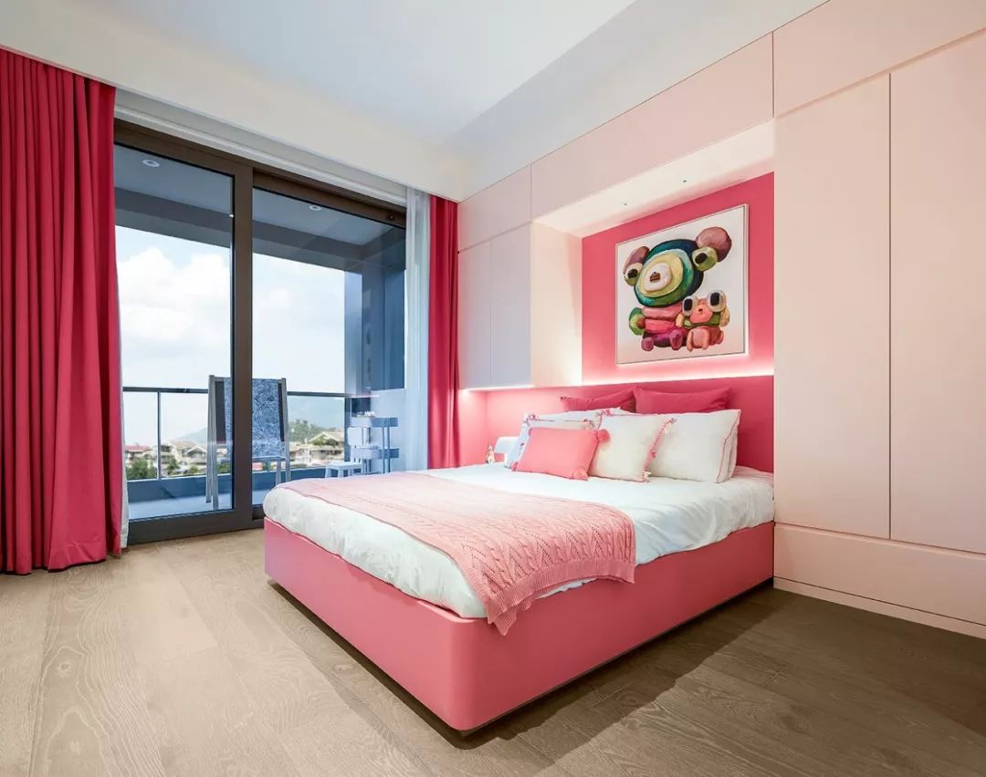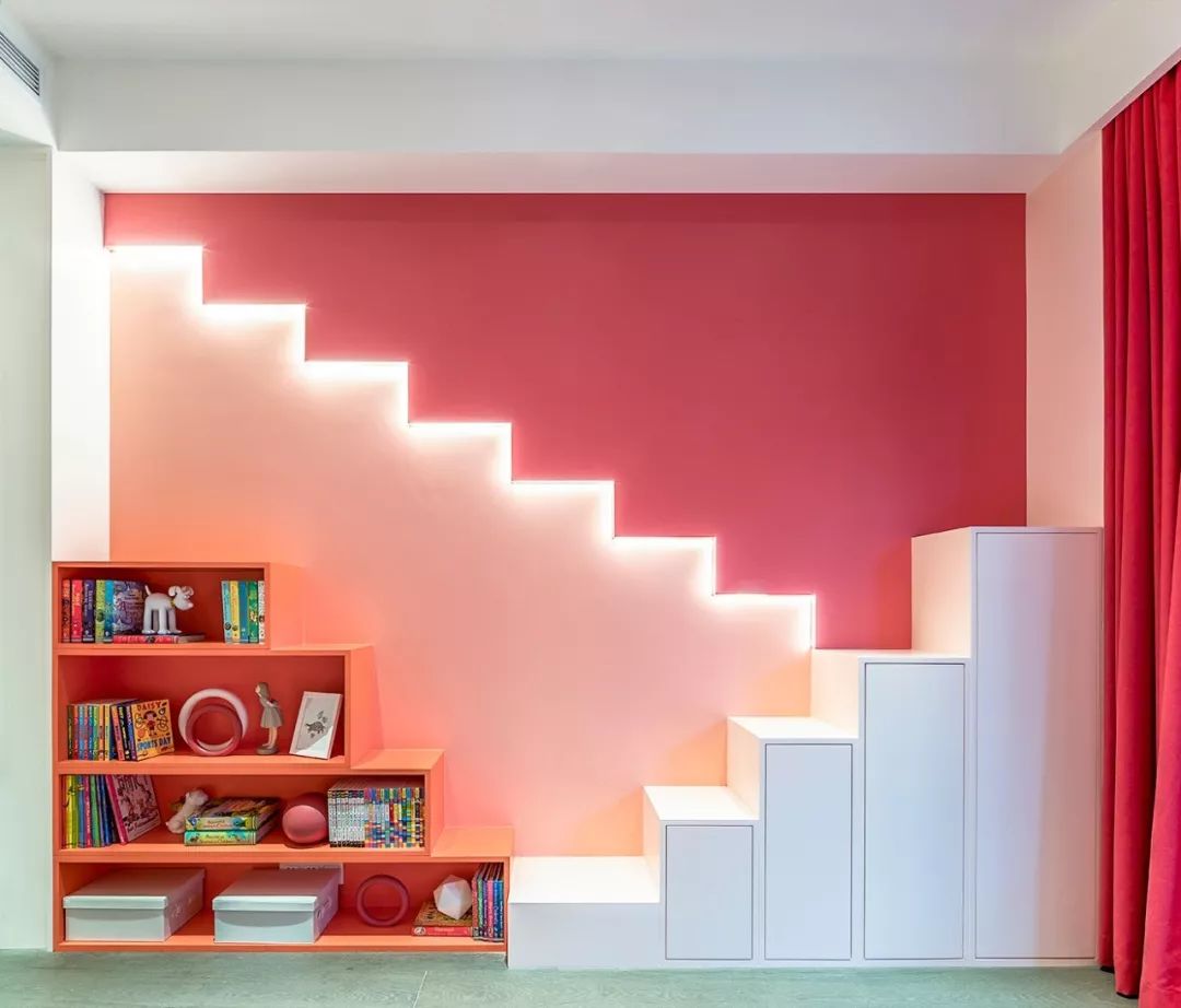 两个儿童房同样有着非常大胆的配色。粉色的这间房里,其阶梯墙的设计灵感源于建筑师 Luis Barragan 的艺术作品,突出整户现代艺术的主题,同时具有收纳作用。