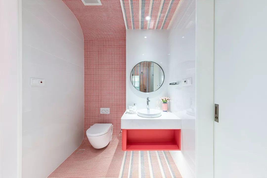 两个儿童房中间有一个共用卫生间,巧妙串联起孩子们的生活空间,卫生间天花和地面是由两个曲面 C 字形互相交错组合。墙面地面用橘色拼蓝色条纹马赛克,形成两个房间的过渡。