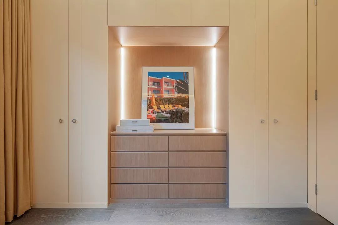 主卧设有 U 字形开放式衣橱,满足男女主人的各式衣物及首饰收纳,衣柜上还设置了可移动的梳妆镜。