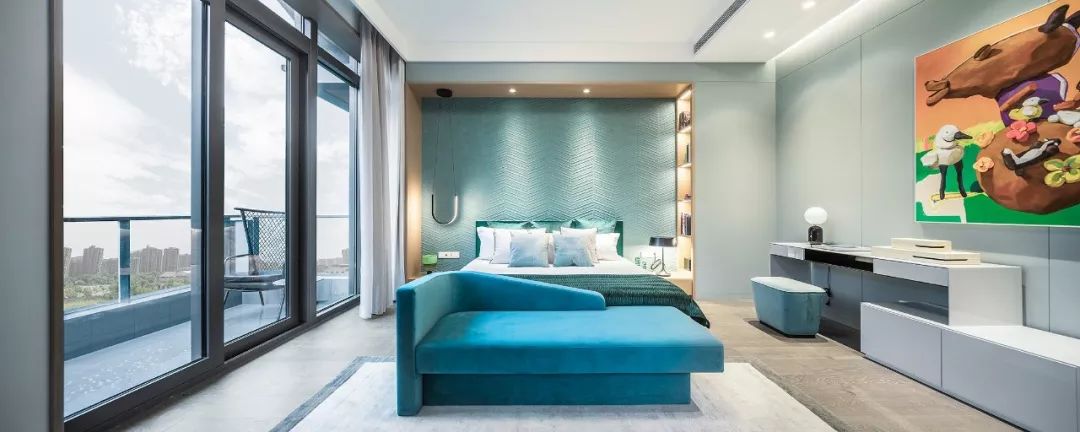 来到三层主卧室的空间,以薄荷绿为主色调,随处可见的挂画提高了整体的艺术氛围。