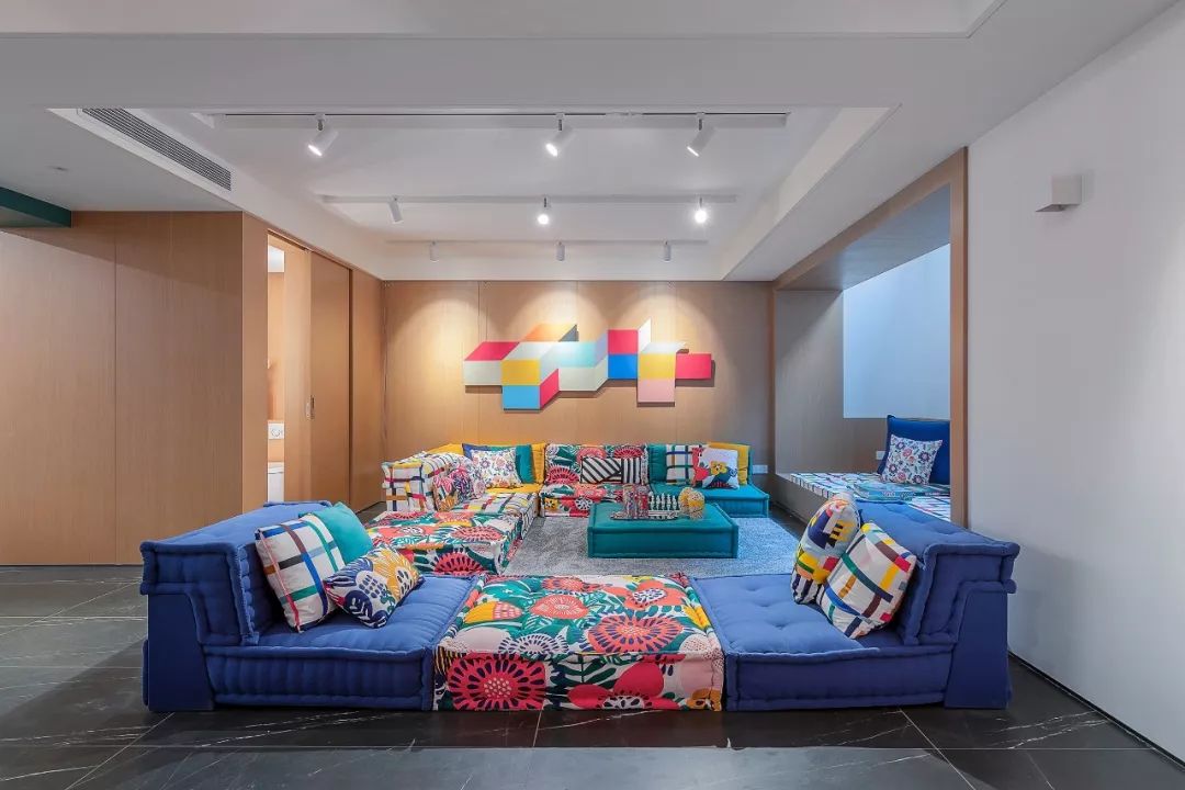 设计师用不同花色的布料打造出一个有趣舒适的沙发区,一边是结合了建筑设计的天窗,将室外的自然采光引入室内。
