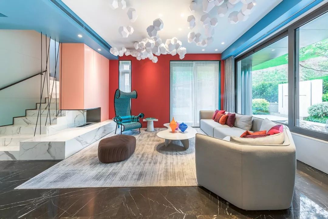 Andy Burgess 绘画作品 一层客厅,有着色彩强烈的墙体风格,绿色、蓝色和一整面的红色墙面交织在一起,搭配几何方块造型顶灯,混合出奇异的空间效果。整个空间的色彩达到一致的平衡,充满了当代艺术设计的气氛。