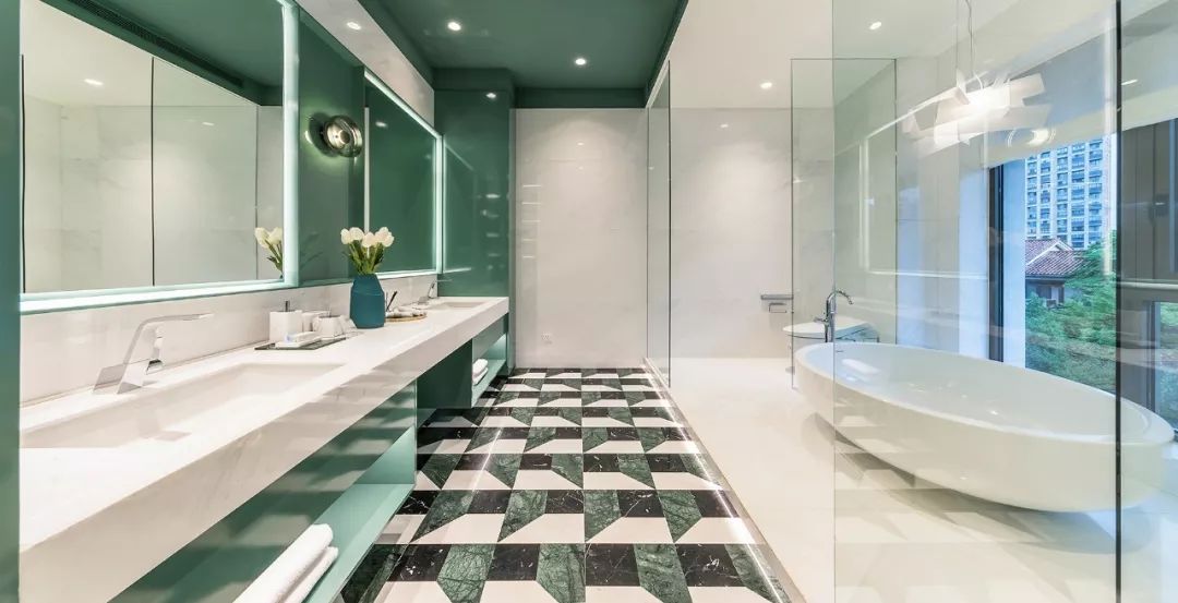 三层的卫生间延续了卧室的设计语言,地面采用了三种不同的大理石拼花组合,黑色、雅士白、印度绿三种颜色,让地面具有立体的空间感觉。