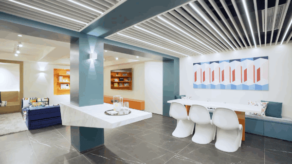 空间的地面则采用了仿黑白大理石地砖,天花的造型连接墙面的结构柱,几何化的简单构筑物,整个颜色和天花板颜色融为一体。 开阔的空间和设计合理的功能区,展现了让父母和孩子一起互动的设计主旨。