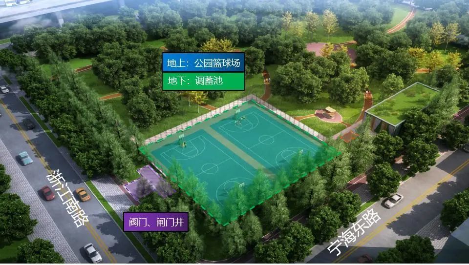 新延安东提标调蓄池位于黄浦区延福公园西南角的篮球场下方,总占地面积2926.9 平方米。通过打造一座“绿色”提标调蓄池,并结合后期少量的管道翻排,能够将系统内排水能力由一年一遇提升至五年一遇,暴雨天启用调蓄池后可有效提高系统的防涝能力,确保地区的防汛安全。同时,项目结合公园篮球场建设,通过服务周边居民,打造环境改善、休闲活动、城市形象等多元化功能体系,实现中心城土地集约化开发利用,为中心城区绿色调蓄设施的布局建设作出了良好的示范。
