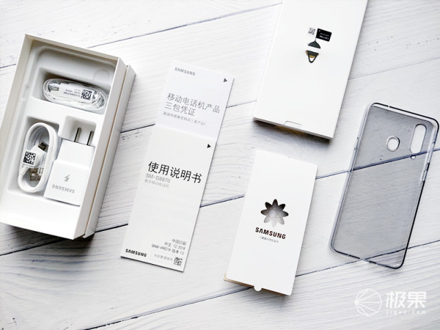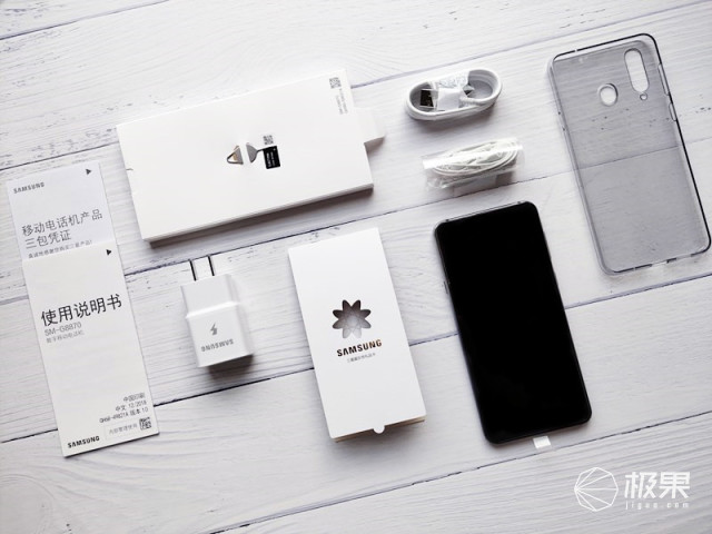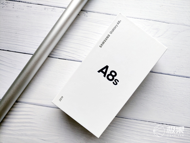 三星Galaxy A8s采用了流行的白色纸质包装,风格极简,正面印有手机型号、品名,左上角标明了手机的发布时间“2019”。