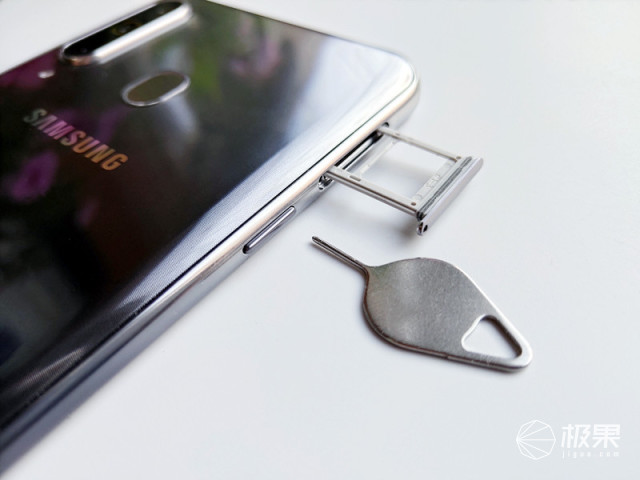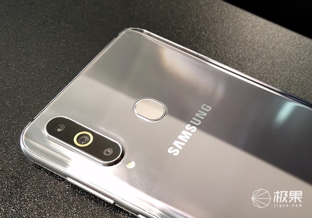 A8s并未配备屏下指纹,指纹模块安置在了手机背面,解锁速度还不错,指纹模块下方印有三星的logo。