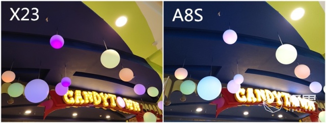 在宽容度方面,A8s明显是弱项,估计主摄像头的像素尺寸不会太高。下图中可以明显看到,在同为自动拍摄时,为了提升暗部可视细节A8s强行提高了曝光,这就导致“CANDYTOWN”灯条中的灯珠无法表现出来,灯光处一片模糊,而因为提升曝光,而使得整个照片的色彩也发生了改变,变亮也变得更淡。