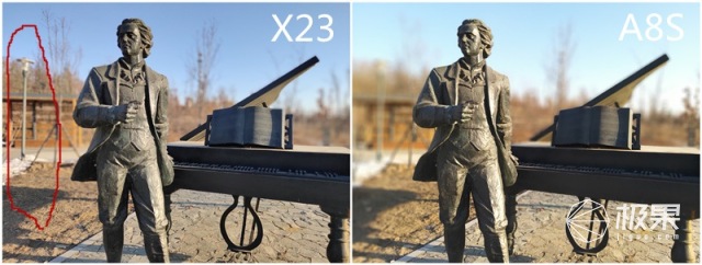 下图中的二者同样为同一焦点,最大虚化效果,可以看到X23的红圈处依然没有完全虚化,而A8s的虚化效果则非常不错,可以说在虚化方面,A8s是要胜过没有专门虚化镜头的X23的。
