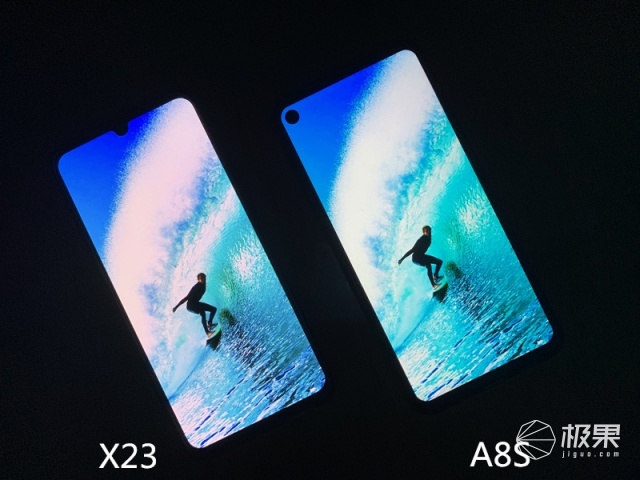 和水滴屏类似,为了增大屏幕面积,A8s同样把麦克风位置放在了屏幕边缘。A8s的屏幕叫做“黑瞳全视屏”,直径6.7mm,名字很犀利,和同样为挖孔屏的荣耀V20相比,A8s的开孔面积要显得更大一些,其中内嵌了一颗2400W像素的自拍摄像头。
