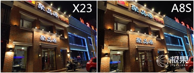 A8s的夜拍和X23还有些差距,色彩还原不够准确,下图中的招牌“聚品源”本来是白色灯光,但在A8s拍摄下,灯光有些偏蓝,X23则准确的还原了灯牌的原本颜色。