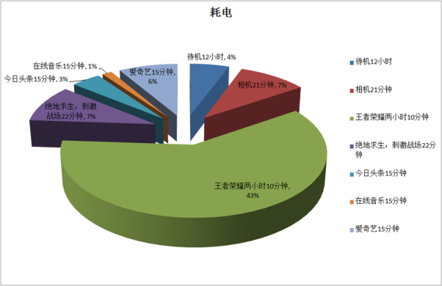 从图中可以看到游戏依旧是耗电大户,玩王者荣耀两小时十分钟,耗电43%,基本上玩几个小时王者荣耀就没电了。玩绝地求生:刺激战场22分钟耗电7%,其余行为并不是太过耗电,待机12小时耗电4%,相机21分钟耗电7%,刷今日头条15分钟3%,看爱奇艺在线视频15分钟,耗电6%,在线音乐最为省电,15分钟只耗电1%。