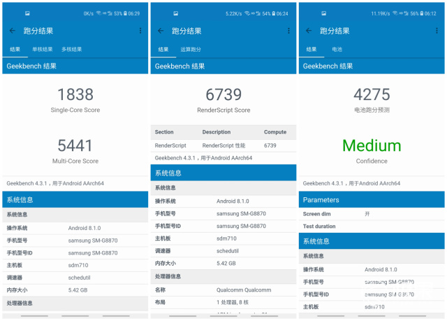 接下来是Geekbench4,单核跑分1838,多核跑分5441,GPU分数6739,电池跑分4275,都在正常范围之内。