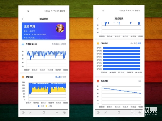 首先是王者荣耀,在王者荣耀改版后,配置要求也相应提升,在开启所有可开选项,并且所有画质设置均为最高的情况下,(分辨率由于机型不支持,无法设定超高,仅能设定超高),游戏运行的十分流畅,平均帧数为55帧,平均波动为5.18帧,虽然帧数有所波动,但在游戏过程中,基本感觉不到,完全没有什么卡顿的感觉,各种操作都很灵活顺畅。